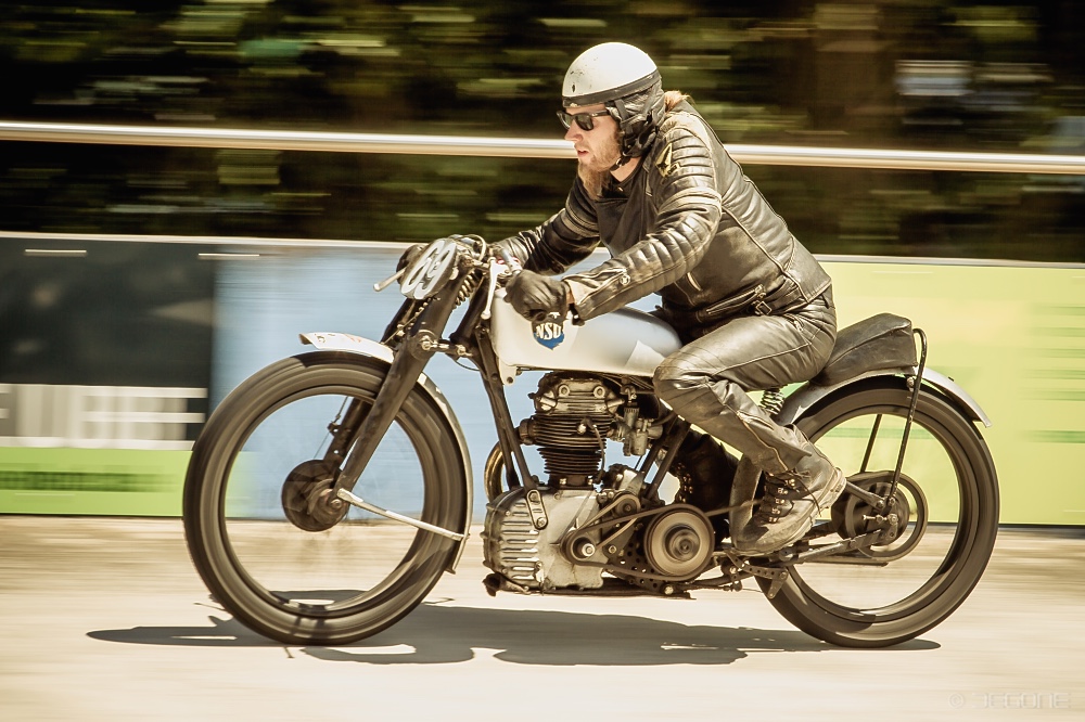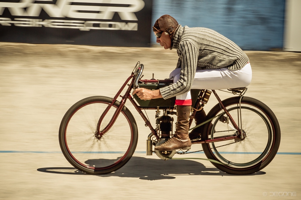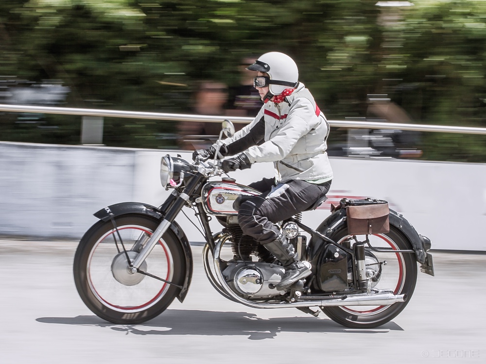 Steilkurven im Beton-Oval und donnernde Motoren gepaart mit super Stimmung – das war Vollgas Rennspass. Es war mein persönlicher Höhepunkt des Jahres für mehr als eine Dekade. Für alle, die dabei sein konnten, war es ein bleibendes Erlebnis. Wo bekommt man schon eine alte Indian zu Gesicht oder einen Vorkriegs-Boardtrack-Racer? Heute nur im Museum. Vollgas-Renspass war mehr als ein Museum. Es gab nicht nur eine Indian oder einen Boardtracker – es waren gleich ganze Gruppen dieser Raritäten mit ihren stolzen Besitzern im Velodrom unterwegs. Ein rollendes Museum, bei dem man die alten Bikes erleben konnte – live und in Farbe. Die 50er Jahre lebten wieder auf, als die Motorräder aus der Nachkriegszeit ihre Runden im Diatest Velodrom in Darmstadt drehten. Wenn die Mopeds und Mofas auf der Strecke waren, fühlte sich so mancher wieder an die Zeit der eigenen Jugend erinnert. Das erste Mofa, das erste Moped – endlich mobil und auf dem Weg erwachsen zu werden. Damals in den 70ern begann sich die motorisierte Zweiradwelt auch in zwei Lager zu teilen. Man fuhr Motorrad oder Roller – das war ein Unterschied. Die beiden Läger wurden beim Vollgas Rennspass wieder vereint. Egal ob Roller oder Motorrad, beides hatte den gleichen Stellenwert. Ein später Beitrag zur Integration und Wiedervereinigung. Die Teilnehmer mit historischen Motorrollern waren immer zahlreich vertreten und es gab viele Raritäten zu bestaunen. Die mittlerweile fast vergessenen Velosolex waren auch stets mit vielen Fahrzeugen dabei. In den 60ern war die Solex eine günstige motorisierte Fortbewegungs-Möglichkeit und heute ist Velosolex fahren Entschleunigung pur. Der Höhepunkt der Veranstaltung war immer die Klasse der Boardtrack-Racer. Das nicht nur bei der Show im Oval, sondern bereits bei der Prozedur vor dem Start. Wenn die Boardtracker unterwegs auf der Strecke waren, tobte es bei den Zuschauern. Ganz speziell waren auch immer die Vorkriegs-Bikes. Ich erinnere mich noch gut an die Veranstaltung, als Paul Valkenet aus den Niederlanden mit seiner Lurquin et Coudert aus 1904 in Aktion eindrucksvoll seine Runden drehte. Es sind unvergessliche Momente, die man erst so richtig wahrnimmt, wenn es vorbei ist. Leider ist es mittlerweile Geschichte und ich bin froh, dass ich bei so vielen Veranstaltungen dabei sein konnte. In meinen Fotos lebt Vollgas-Rennspass jedoch weiter und in den Erinnerungen.